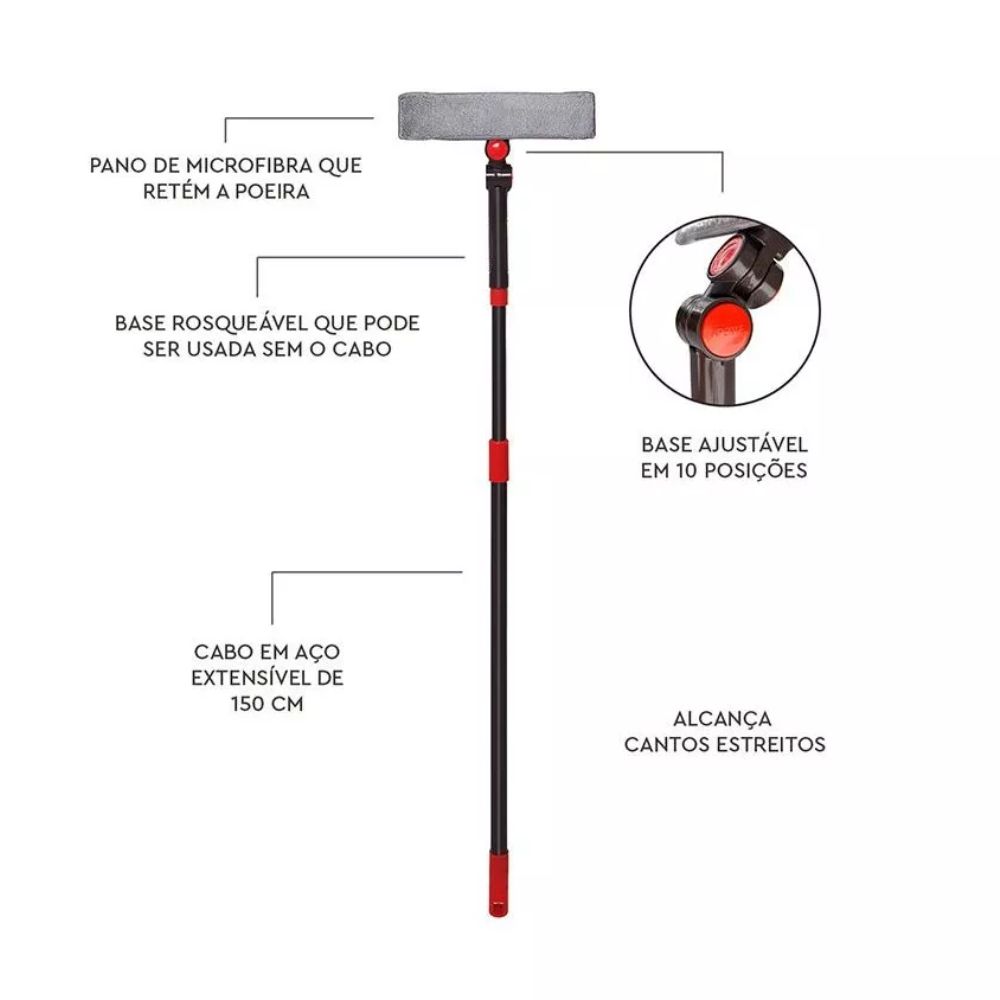 Rodo e Esfregão Limpa Vidro 2 em 1 de Borracha Com Cabo de Aço Extensível 150cm