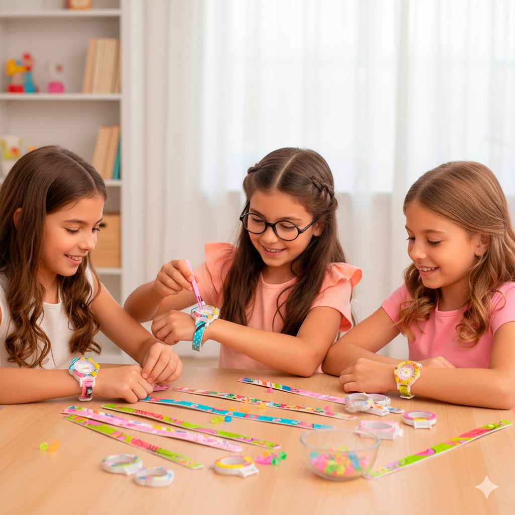 Liberte a imaginação e a moda! Permite que as crianças criem seus próprios acessórios exclusivos, combinando a diversão das miçangas coloridas com a funcionalidade de um relógio. -As peças podem ser facilmente desmontadas e remontadas, permitindo que a criança crie um acessório diferente a cada dia. - O ato de manusear e encaixar as miçangas ajuda a desenvolver a destreza manual e a concentração. -É o presente perfeito para estimular a criatividade, a coordenação motora fina e o senso de estilo. Especificações Técnicas: - Material: Plástico/Componentes elétricos: - Idade recomendada: +06 anos - Comprimento da pulseira: 17cm - 8 engates - 4 pulseiras - 9 relógios Itens Inclusos: - 110x Peças