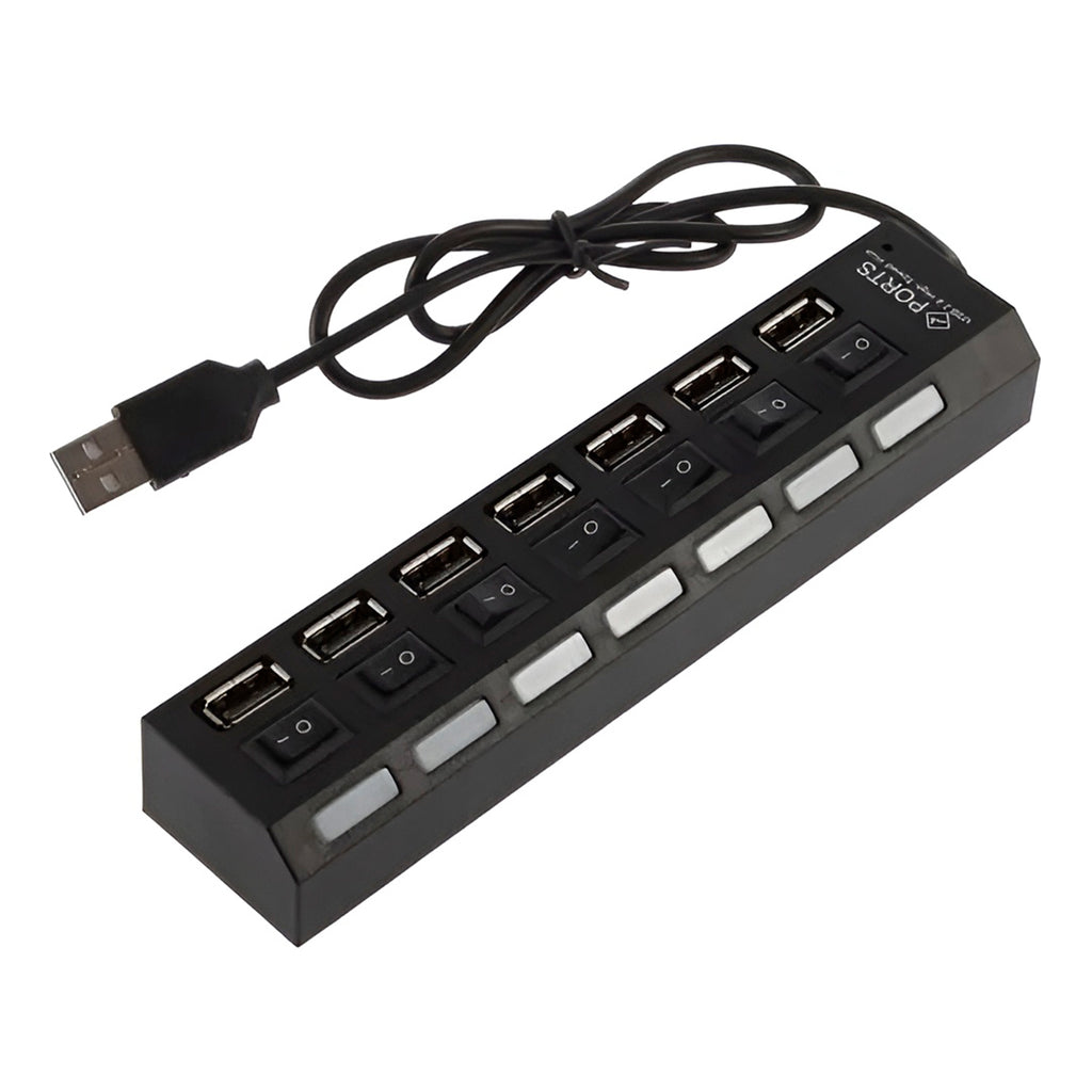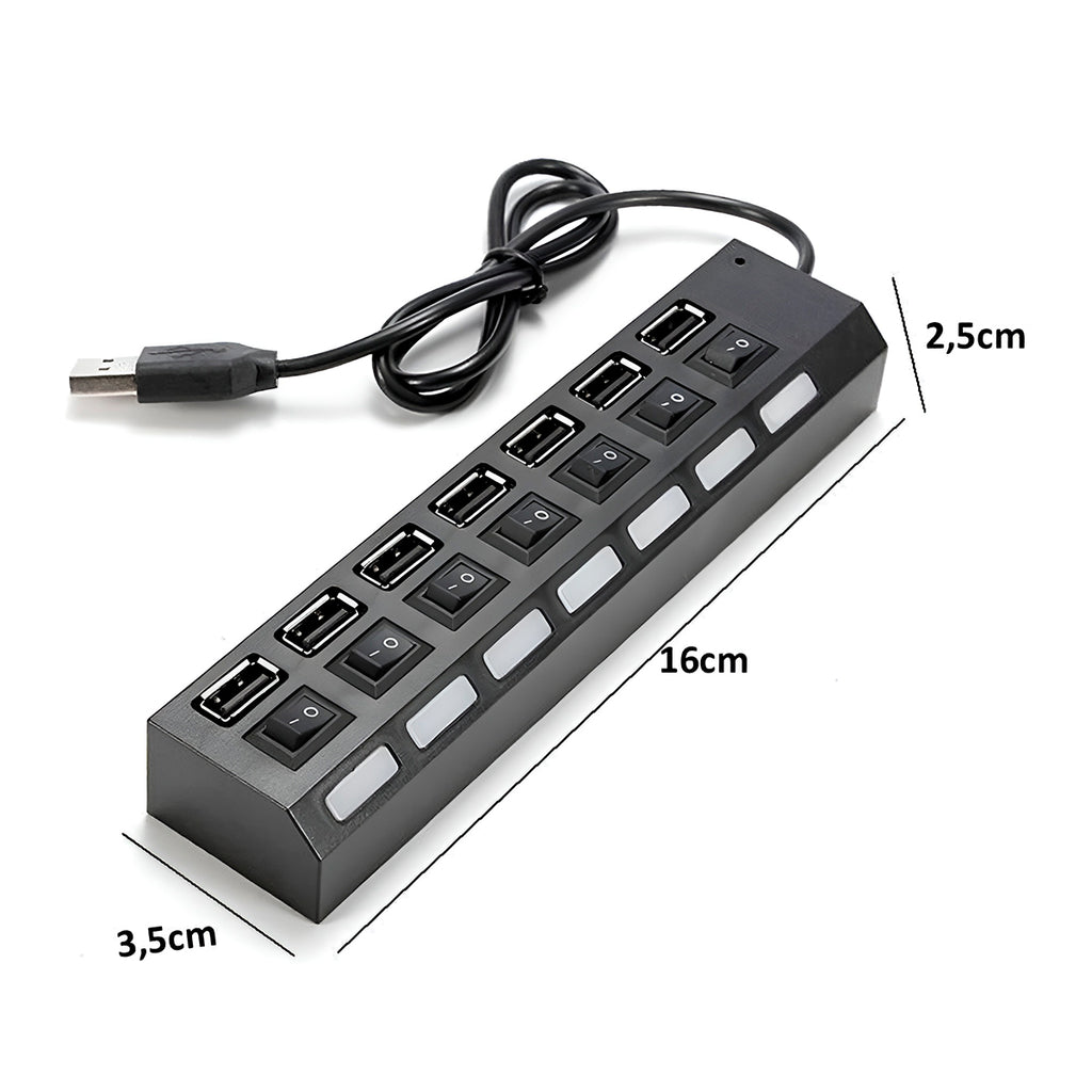 Precisando de mais portas USB no seu computador? Com o nosso Hub USB 7 Portas, você multiplica suas conexões de forma rápida e fácil! Ideal para quem precisa conectar diversos dispositivos ao mesmo tempo, como: - Organização: Mantenha sua mesa organizada com todos os seus dispositivos conectados em um único lugar. - Praticidade: Não precise mais ficar trocando cabos. - Eficiência: Aumente a produtividade com transferências de dados mais rápidas. - Versatilidade: Ideal para uso em casa, no escritório ou em viagens. Especificações Técnicas: - Modelo:Hub Usb 7 Portas - Material: Liga de Alumínio, Borracha, Componentes Elétricos. - Cor Preto - Entradas: 7x USB 2.0 1.1Gb/s (Compatível com USB 2.0 e 1.1) - Dimensões Aprox.: 16cm (COMPRIMENTO) x 3,5cm (LARGURA) x 2,5cm (ALTURA) - Alimentação: DC 5V USB -Taxa de transferência de dados: 1.5MB/s, 12MB/s, 60MB/s - 480MB/s - Comprimento do cabo: 43cm - Indicador LED - 7 interruptores - Proteção contra sobretensão Itens Inclusos na Embalagem: - 01x Hub 7 Portas
