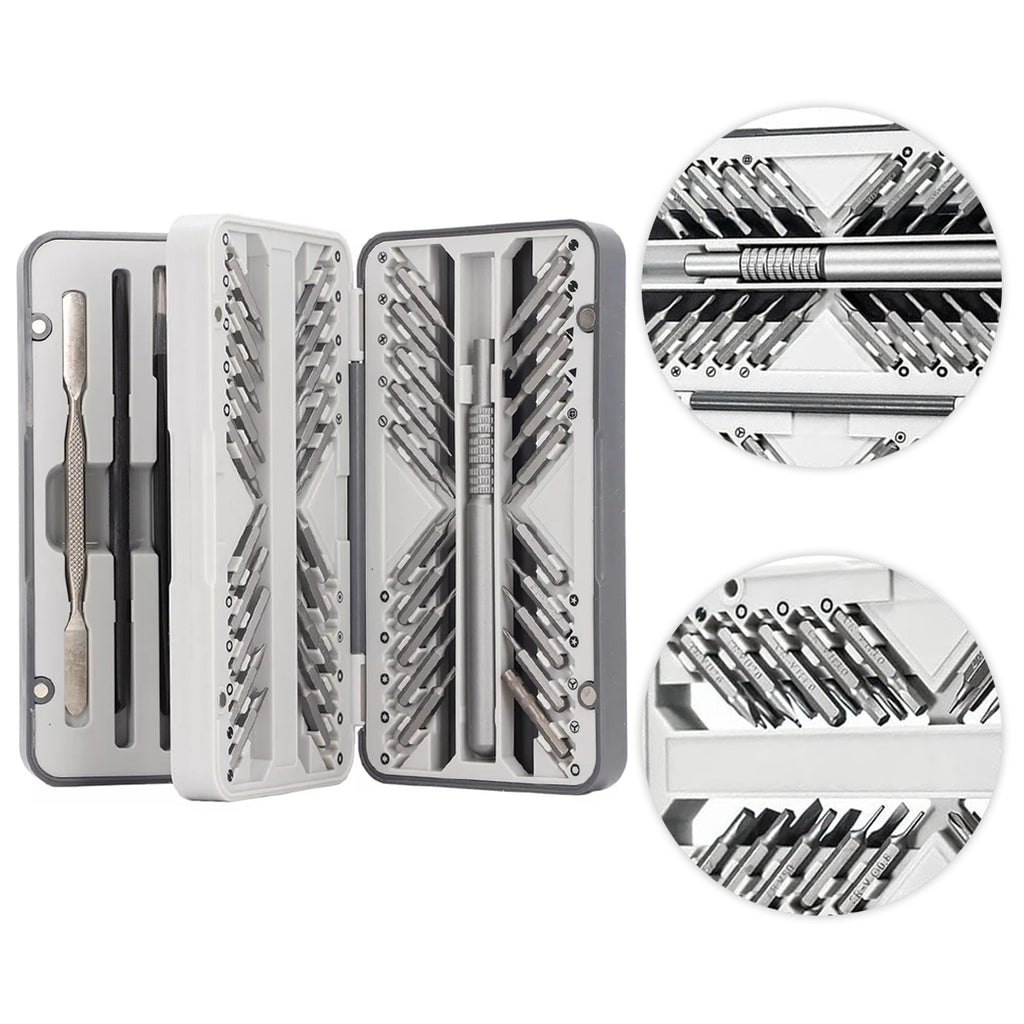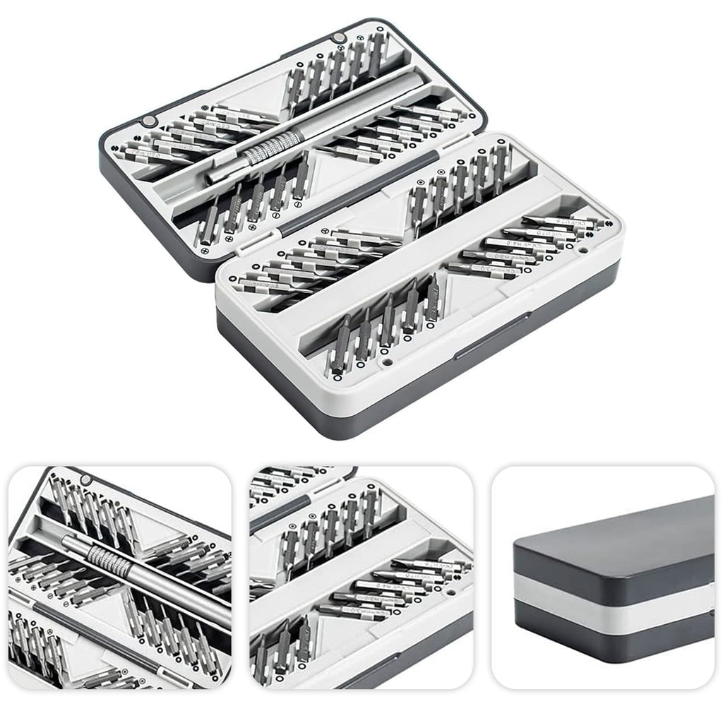 - 60 pontas de precisão para parafusos de todos os tipos e tamanhos, incluindo fenda, Phillips, Torx, estrela, triângulo e agulha.
