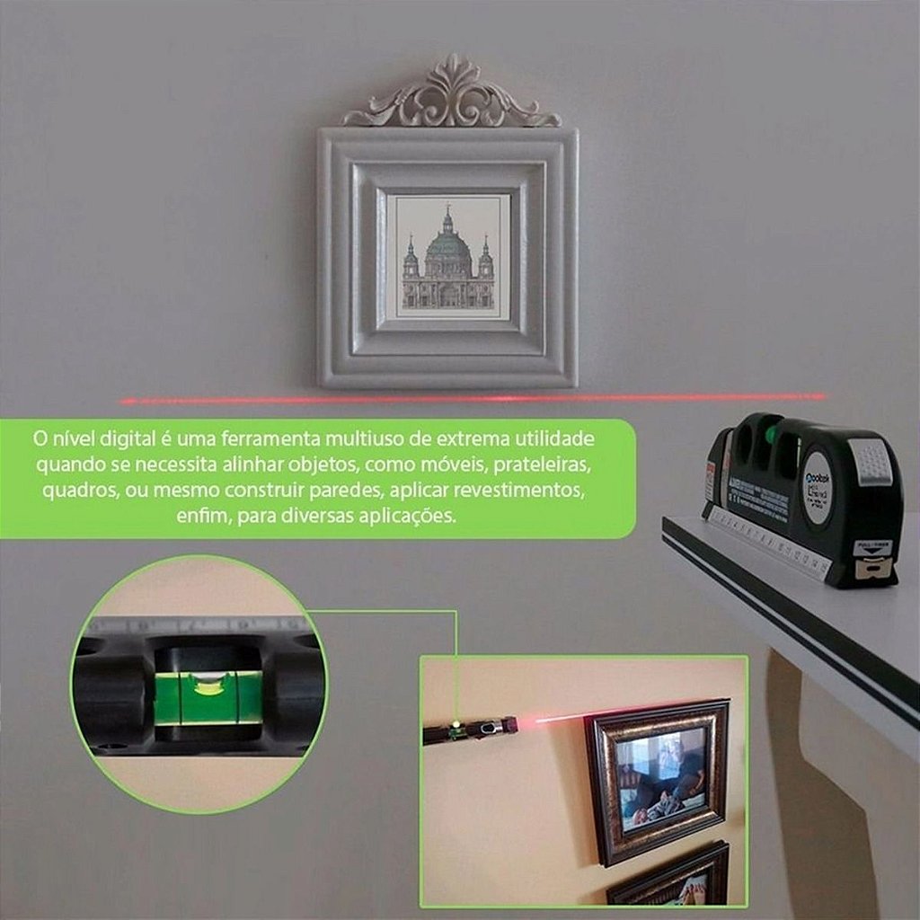 Nível a laser profissional com trena e régua O Nível Digital é uma ferramenta multiuso de extrema utilidade quando se necessita alinhar objetos, como móveis, prateleiras, quadros, cortinas ou mesmo construir paredes, aplicar revestimentos, enfim, para diversas aplicações, bem como, nivelamento de piso, nivelador de cortinas e paredes. Este produto auxilia em várias tarefas Alinhar objetos, Colocar quadros, Objetos ou prateleira na parede, Instalar televisores em paredes ou painéis, Auxilia na construção, reformas e outras necessidades domésticas do dia a dia. - Medições precisas de forma rápida, fácil e eficaz - Ideal para instalar prateleiras - Nível a Laser com interruptor e alcance de até 8 metros - Possui trena de aço de 2,5 metros - Projeta o feixe de laser na horizontal, vertical ou em cruz Especificações: Comprimento de onda do laser: 650nm Alcance do Laser: Até 8m Comprimento da fita métrica: 2,5 metros Tamanho: 18,5 (C) x 6,2(L) x 3,5 (A) centímetros Peso: 198 gramas Funcionamento: 3 baterias AG13 (encontrada até em supermercados) Itens Inclusos: 1 - Nível Laser Régua 3 - Baterias