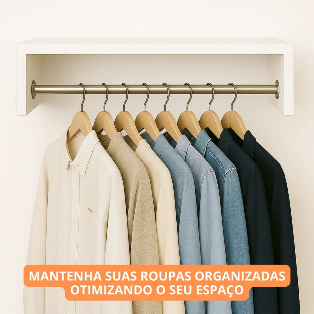 Fabricado em MDF resistente, este cabideiro oferece durabilidade e acabamento elegante, combinando facilmente com qualquer decoração. Sua prateleira superior permite guardar objetos adicionais, enquanto o tubo cromado garante segurança e resistência para pendurar suas roupas favoritas.
