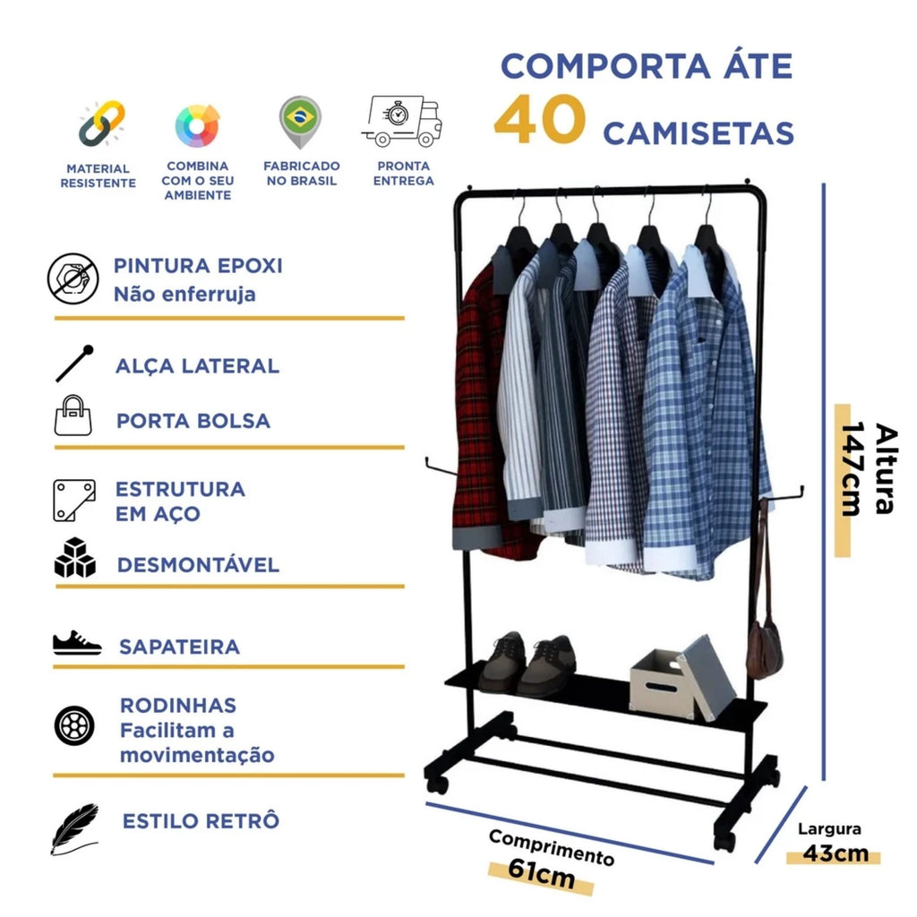 - Indicações de uso: ideal para organizar roupas do dia a dia, roupas sazonais, expositores de loja, apoio em lavanderia e como peça extra em closets e quartos.