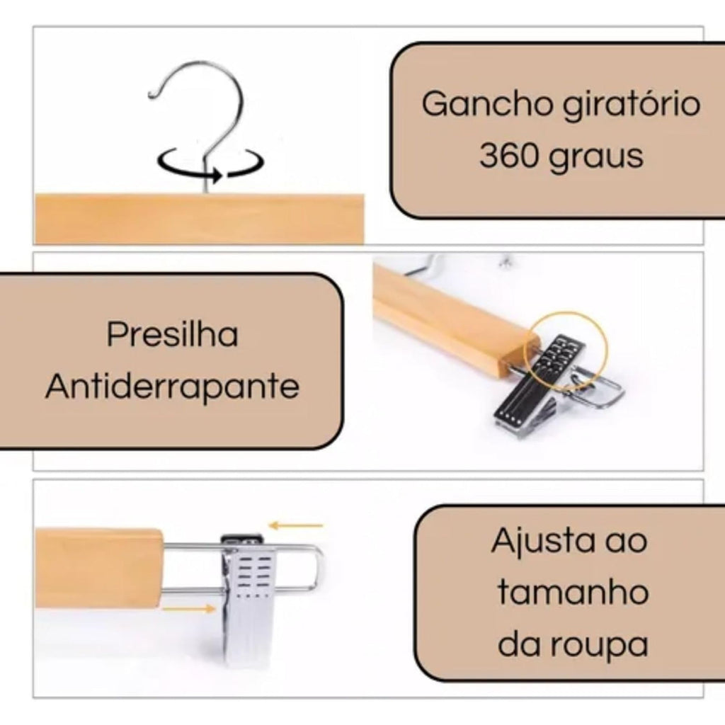 Kit 10 Cabide de Madeira com Presilhas Cromadas Adulto para Calça Bermuda Blazer terno Vestido Saia
