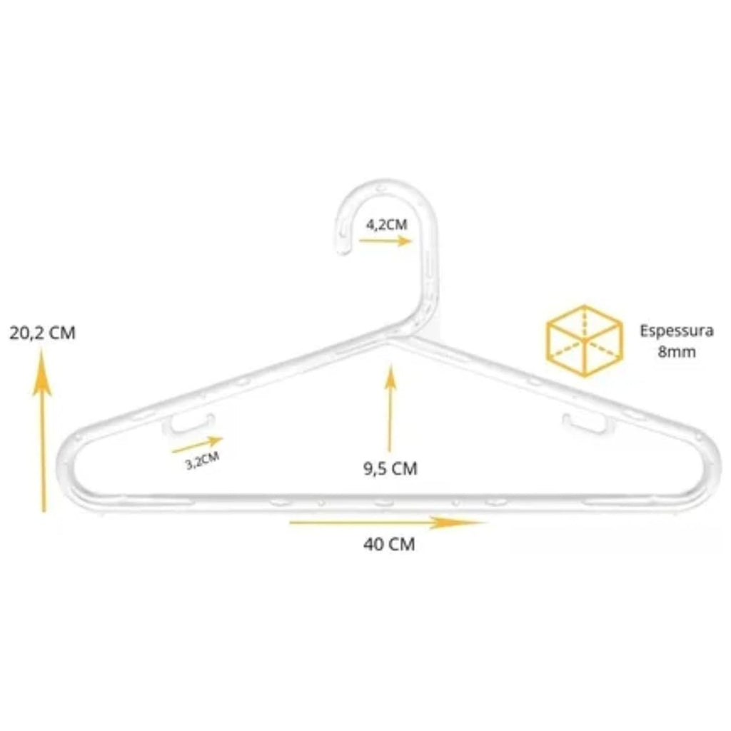 - Dimensões dos cabides: 40 cm (C) × 20,5 cm (A) × 8 mm (E)