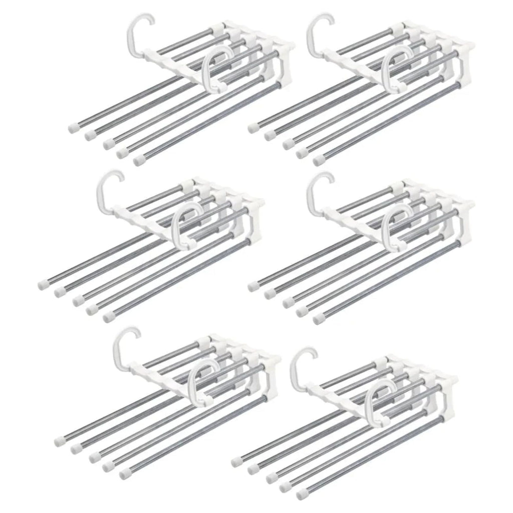 Kit 6 Cabide Multifuncional 5 Divisórias Retrátil Inox para Calças Bermudas Saias Gravatas Branco