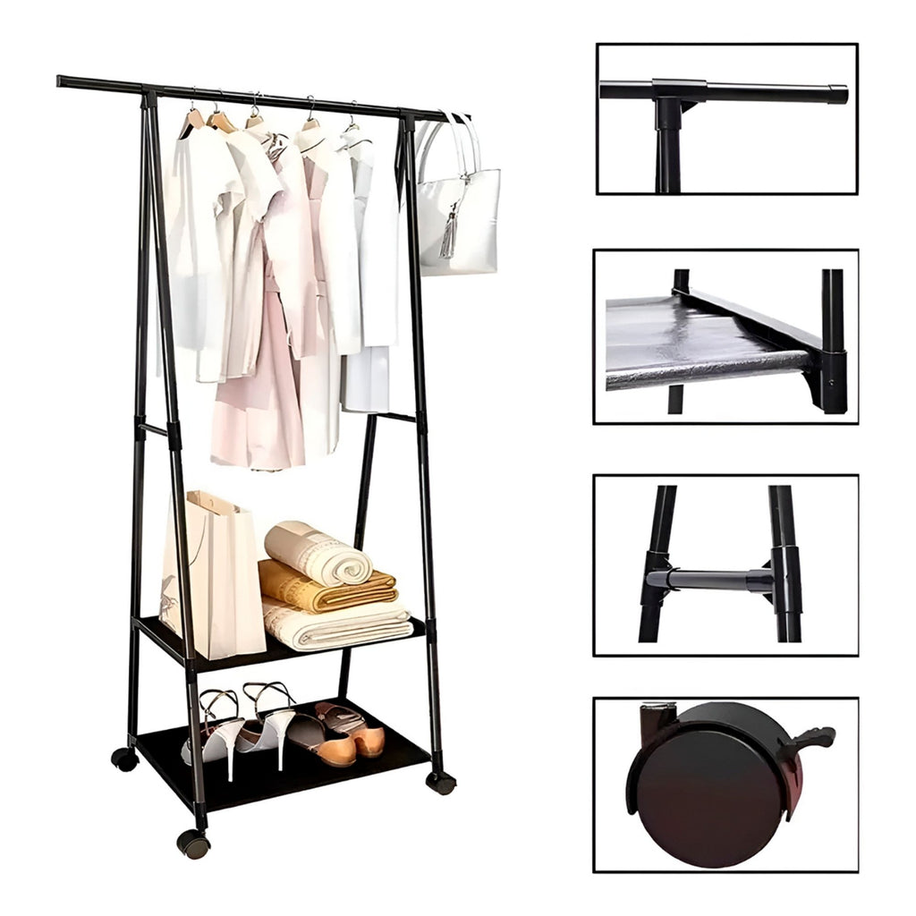 Seu espaço inteligente permite pendurar até 16 cabides e organizar sapatos, caixas ou acessórios nas duas prateleiras inferiores. Além disso, as rodinhas giratórias proporcionam mobilidade total, facilitando a limpeza e o transporte para qualquer ambiente.