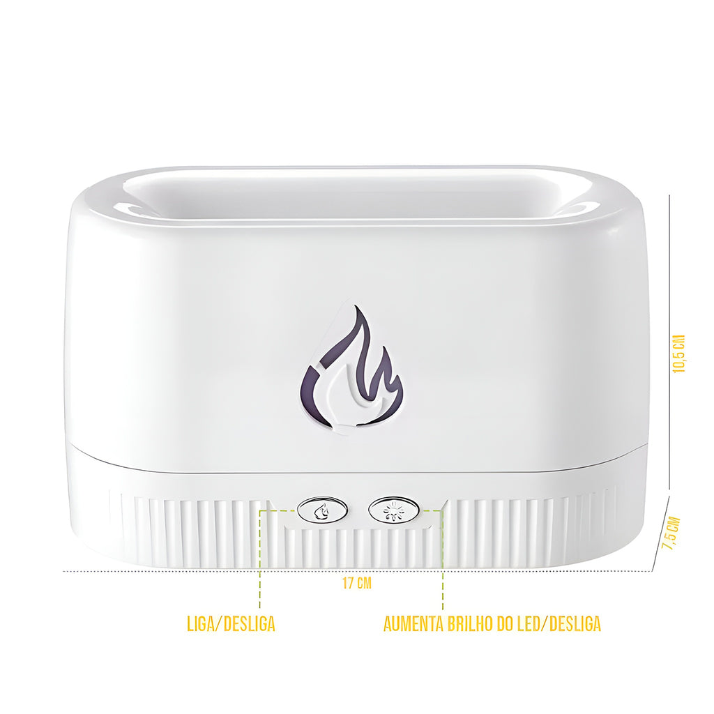 Transforme seu ambiente em um oásis de bem-estar com a magia das chamas e o poder da aromaterapia! Crie uma atmosfera acolhedora, relaxante e perfumada em qualquer cômodo da sua casa ou escritório. -O grande destaque deste difusor é seu efeito visual de chamas LED que simula com perfeição a dança do fogo, sem qualquer risco ou calor. -Essa iluminação suave e alaranjada cria uma sensação de conforto e serenidade, tornando qualquer espaço mais convidativo e relaxante. -Adicione algumas gotas dos seus óleos essenciais favoritos na água para difundir aromas agradáveis e terapêuticos pelo ambiente. Especificações Técnicas: - Material: ABS/PP/Componentes elétricos - Entrada: 5V/2A - Capacidade: 200ml - Tempo deatomização: 30ml/h - Luz LED - Bivolt - Potência: 4.5W - Dimensões Aprox.: 17cm (LARGURA) x 7,5cm (PROFUNDIDADE) x 10,5cm (ALTURA) Itens Inclusos: - 01x Umididificador - 01x cabo USB