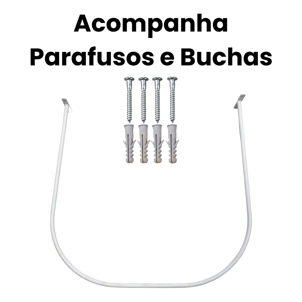 A instalação é simples e rápida, contando com 4 parafusos e 4 buchas inclusos. Apesar de não incluir ganchos ou suporte para guarda-chuva, sua estrutura é ideal para exposição de roupas em araras ou cabides, transformando o provador em um ponto funcional e estético da sua loja.