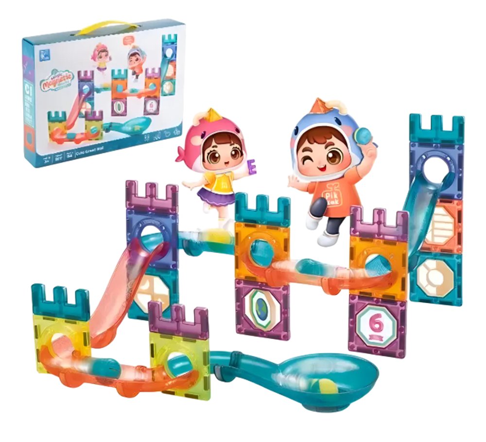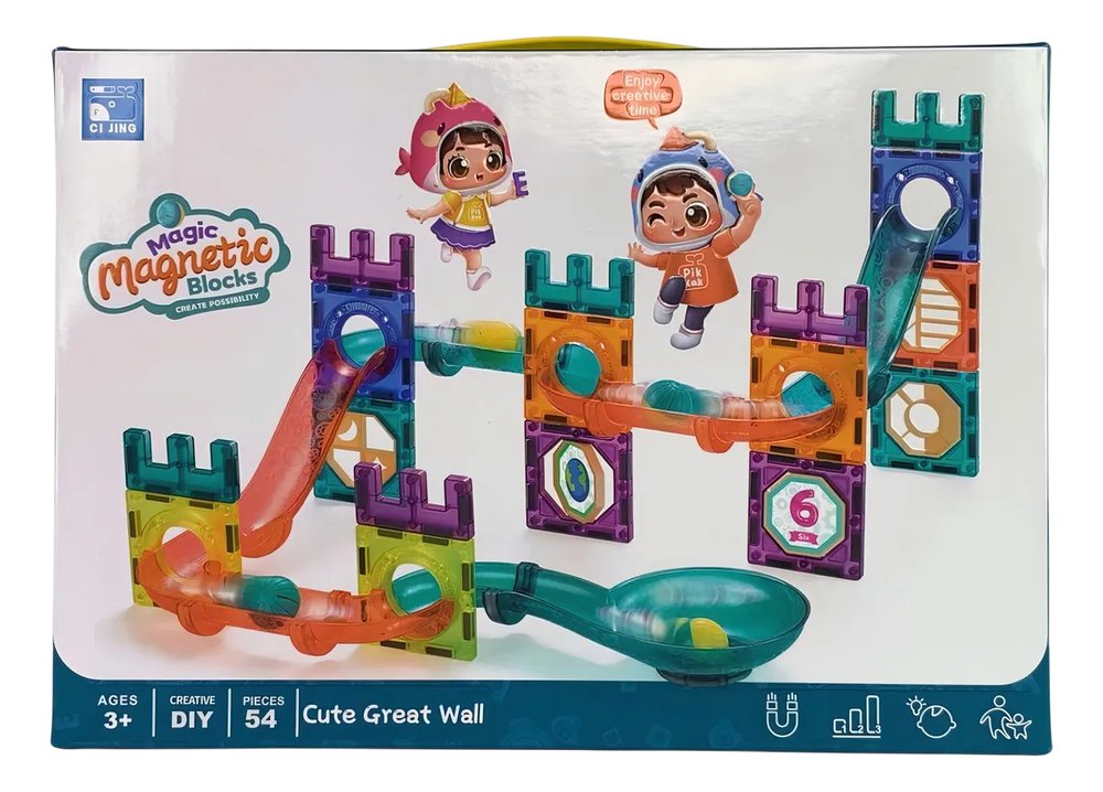 O conjunto possui 54 peças magnéticas, incluindo blocos quadrados, geométricos, peças curvas, retas translúcidas, círculos, hexágonos, triângulos, funis, pistas em espiral e conectores circulares. O sistema de encaixe magnético é fácil e firme, garantindo construções estáveis e permitindo que as crianças criem rampas, torres e túneis enquanto desenvolvem habilidades de coordenação motora fina, percepção espacial e pensamento criativo.