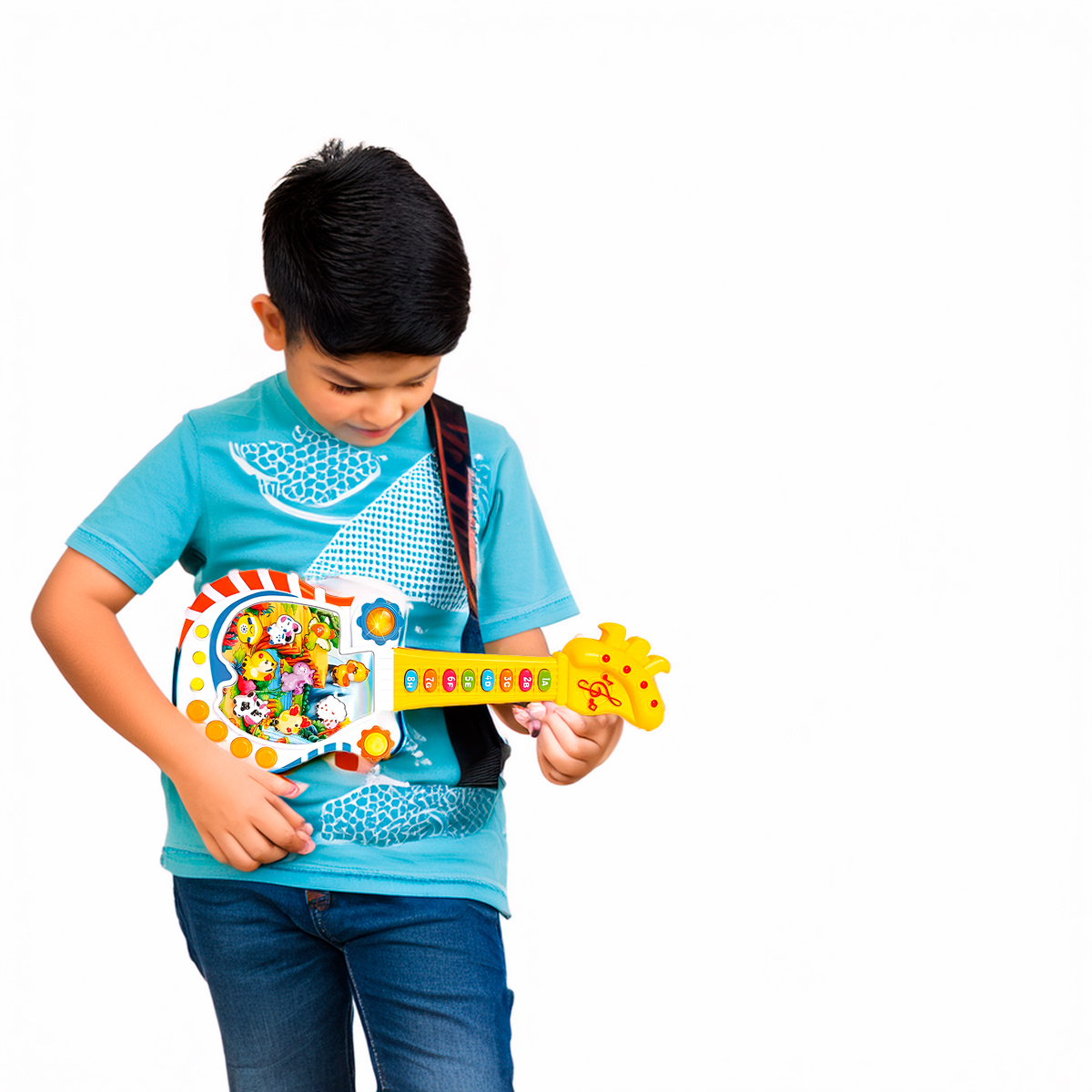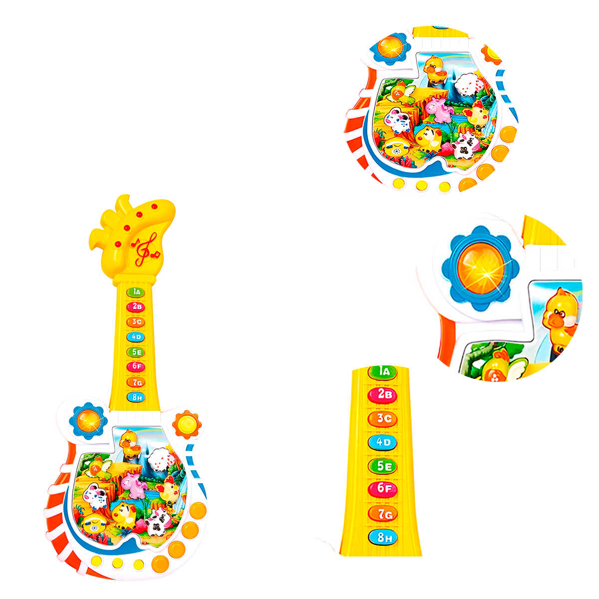 Essa guitarra interativa é a companheira perfeita para as primeiras explorações musicais do seu filho. Estimula a coordenação motora, a percepção auditiva e a criatividade. -As luzes piscam ao som da música, criando um show de luzes mágico. -Confeccionada com material seguro e durável, ideal para as pequenas mãos. -Além dos sons dos animais, a guitarra toca músicas alegres e melodias infantis. – Estimula o desenvolvimento cognitivo e musical da criança. -Proporciona horas de diversão e aprendizado. Especificações Técnicas: – Modelo: Guitarrinha Infantil – Material: Plástico/Componentes Elétricos – Dimensões Aprox.: 43cm (COMPRIMENTO) x 10cm (LARGURA) – Fonte de Alimentação: 3 Pilhas AA (NÃO INCLUSAS) – Idade Recomendada: +3 Anos – Cor: Colorido Modo de Uso: – Modo 1 – Teclas 1 ao 8 / nomes dos animais / som dos animais. – Modo 2 – Teclas A ao H / som dos animais / música. – Modo 3 – Cada tecla numeral toca uma música / som dos animais / músicas. – Modo 4 – Perguntas: “onde está?” para acertar letras, números e animais / “Qual a diferença de” e “qual a soma de” para aprender adição e subtração. Itens Inclusos: – 01x Guitarra Infantil