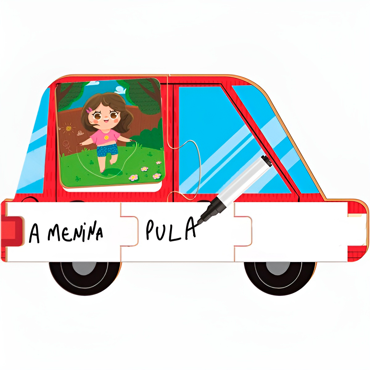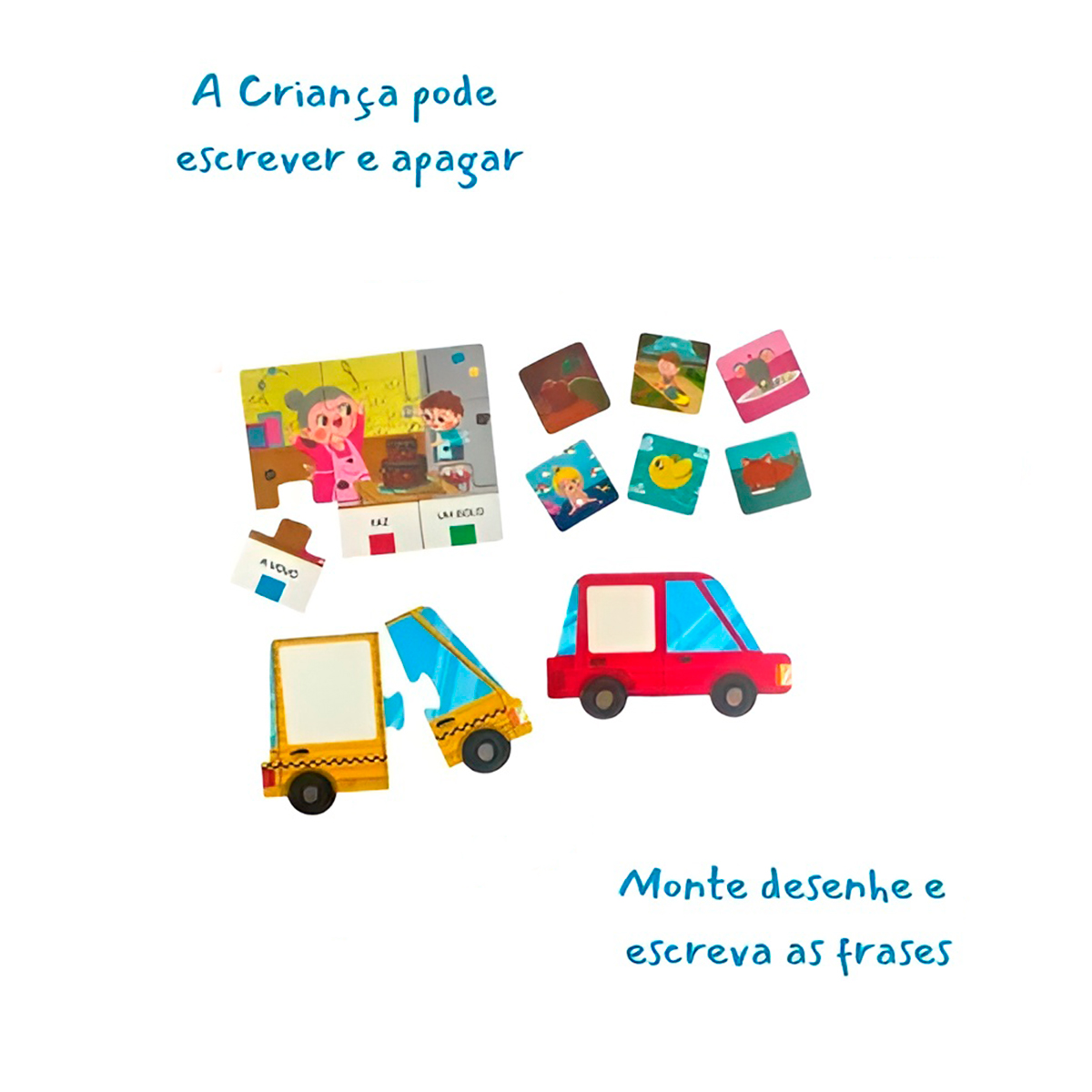 Desperte a curiosidade e o amor pela leitura nos pequenos. Uma forma divertida e educativa de aprender as primeiras palavras e formar frases simples! -Encaixe perfeito: As peças se encaixam facilmente, estimulando a coordenação motora e a percepção visual. -Diversas combinações: As crianças podem criar diversas combinações de palavras, desenvolvendo a criatividade e a imaginação. -Aprendizado lúdico: Uma maneira divertida de aprender o alfabeto, as primeiras palavras e a formar frases simples. -Desenvolvimento da linguagem: Estimula a aquisição de vocabulário e a formação de frases. -As imagens coloridas e divertidas capturam a atenção das crianças e facilitam o aprendizado. -Aperfeiçoa a coordenação olho-mão e a destreza. – Autonomia: Incentiva a criança a explorar e descobrir novas palavras e frases. Especificações Técnicas: – Idade Recomendada: A partir de 04 Anos – Material: MDF – Dimensões Aprox.: 32cm x 35cm x 7cm. -Presente educacional ideal para crianças em idade pré-escolar e escolar – Desenvolve: Pensamento Criativo – Induz a Resolução de Problemas – Estimula a Alfabetização – Carrinho Vermelho: Exercitar a escrita de frases – Carrinho Amarelo: Para desenhar – Peças Brancas: Escrever Frases Itens Inclusos: – 06x Quebra Cabeças – 08x Cards Ilustrados – 03x Peças de Encaixe (Para Escrever Frases) – 02x Carrinhos Quebra Cabeças – 01x Caneta – 01x Apagador Não perca a oportunidade de proporcionar um aprendizado divertido e eficaz para o seu filho!