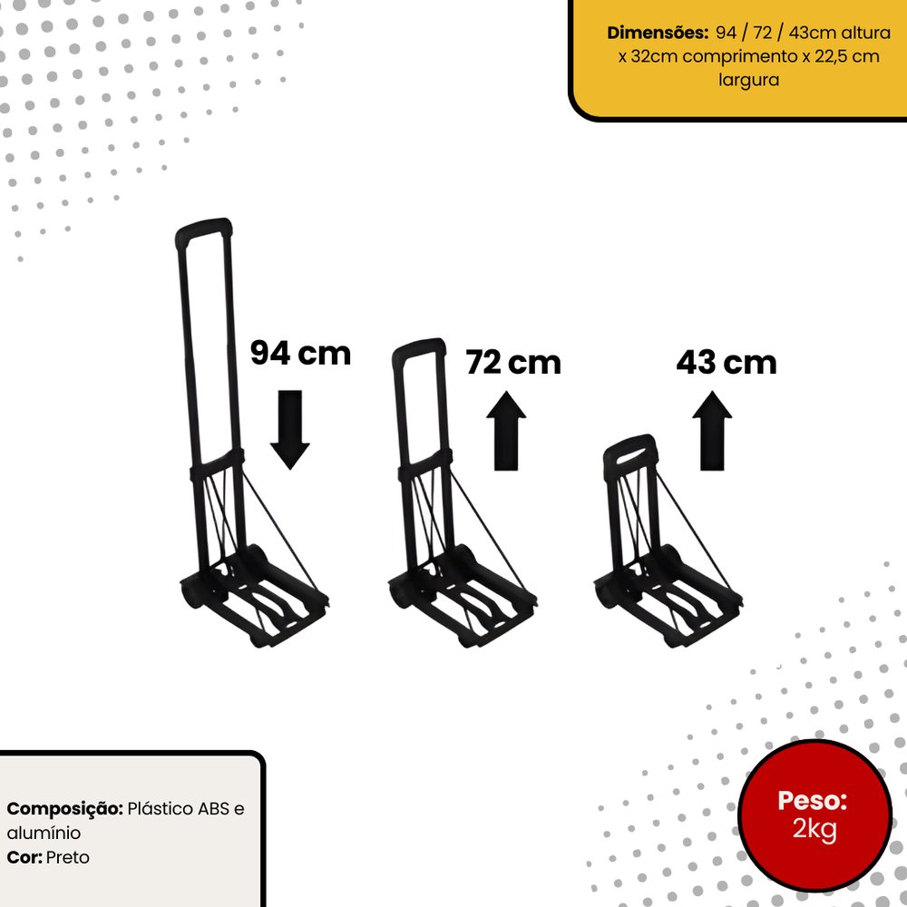 Projetado em alumínio e plástico ABS, possui material resistente e durável, além de possuir propriedades anticorrosivas. O carrinhos de carga pode ser utilizado em diversos cenários, como construções, armazéns, jardins, supermercados e locais de entrega. Facilitando o transporte de materiais, mercadorias, caixas, sacos de compras e outras cargas que seriam difíceis ou cansativas de carregar apenas com as mãos. Quando não estiver sendo utilizado, o carrinho pode ser dobrado de forma compacta, facilitando o armazenamento do carrinho em espaços pequenos, como armários, armazéns e porta-malas de carros.