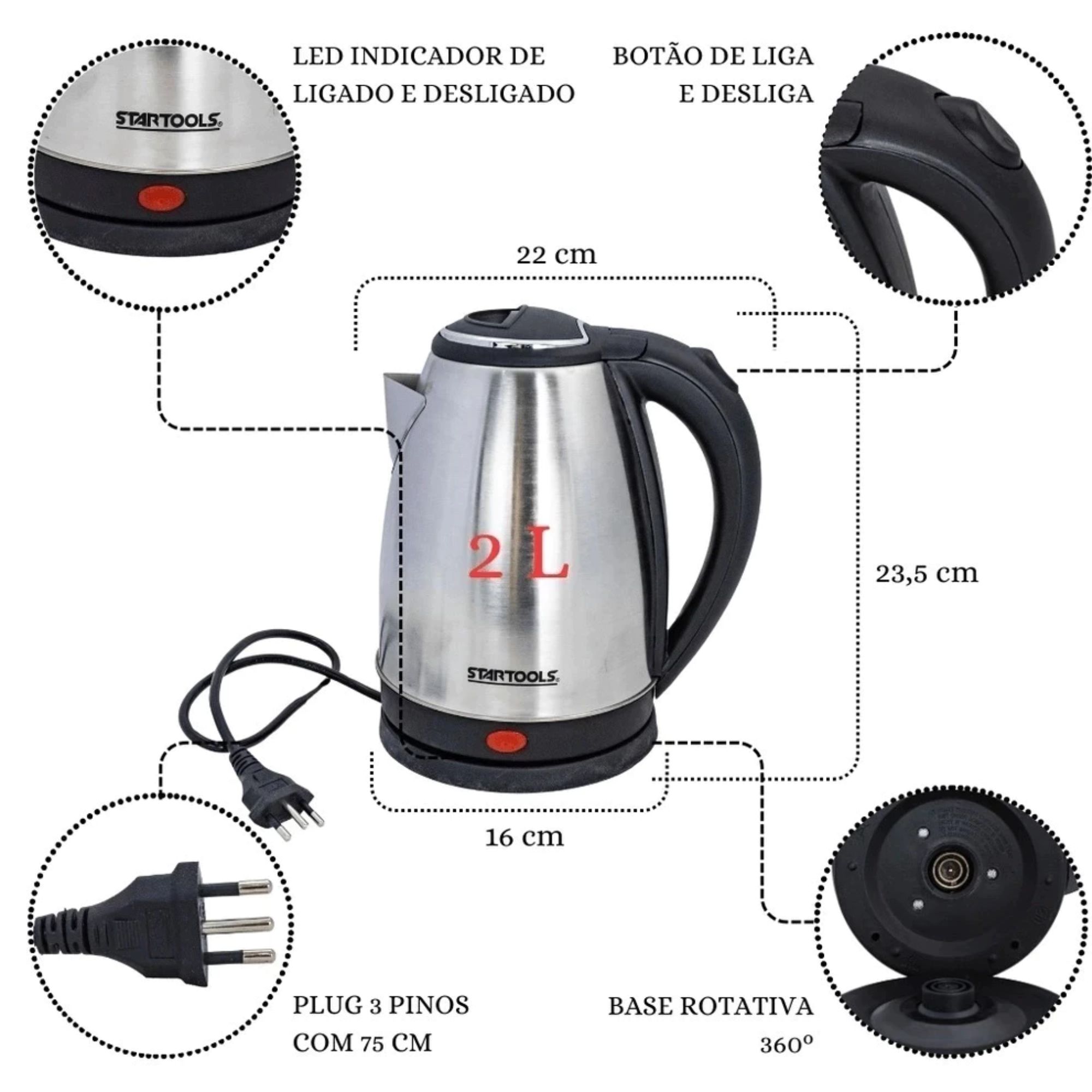 • Capacidade para 2 litros – ideal para chás, cafés, sopas instantâneas e mais