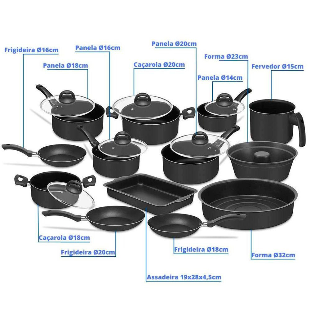 Conjunto de panelas 13 peças Comprar um conjunto de panelas é uma ótima opção para quem quer trocar os utensílios da cozinha e economizar. Tudo de forma vantajosa, você terá; praticidade, harmonização da cozinha e variedade de produtos. O conjunto possuí 13 panelas antiaderentes que facilitam o momento de cozimento, pois impede que a comida grude, e auxilia na limpeza do item também. Ideal para quem está se mudando para um local novo, indo morar sozinho ou está apenas renovando o armário de panelas, o conjunto será uma ótima escolha. Torne sua cozinha ainda mais equipada para que você possa realizar todas suas receitas preferidas. Além disso, as panelas são leves, permitindo que você leve-as onde for, incluindo reuniões entre a família ou amigos, para preparar aquela deliciosa refeição. O material de alumínio auxilia no momento de cozimento, fazendo com que a comida fique pronta rapidamente, a panela possuí também cabos de baquelite, que diminuem a chance de acidentes com queimaduras.