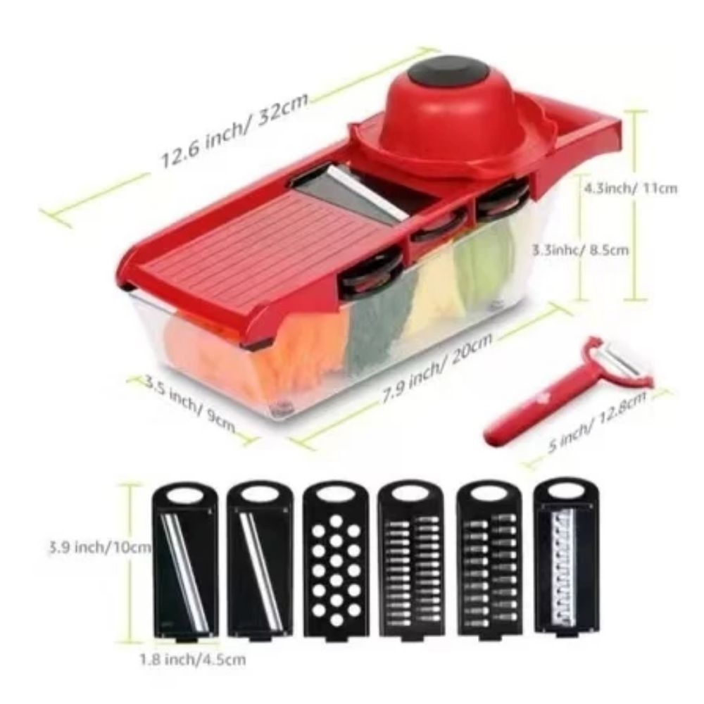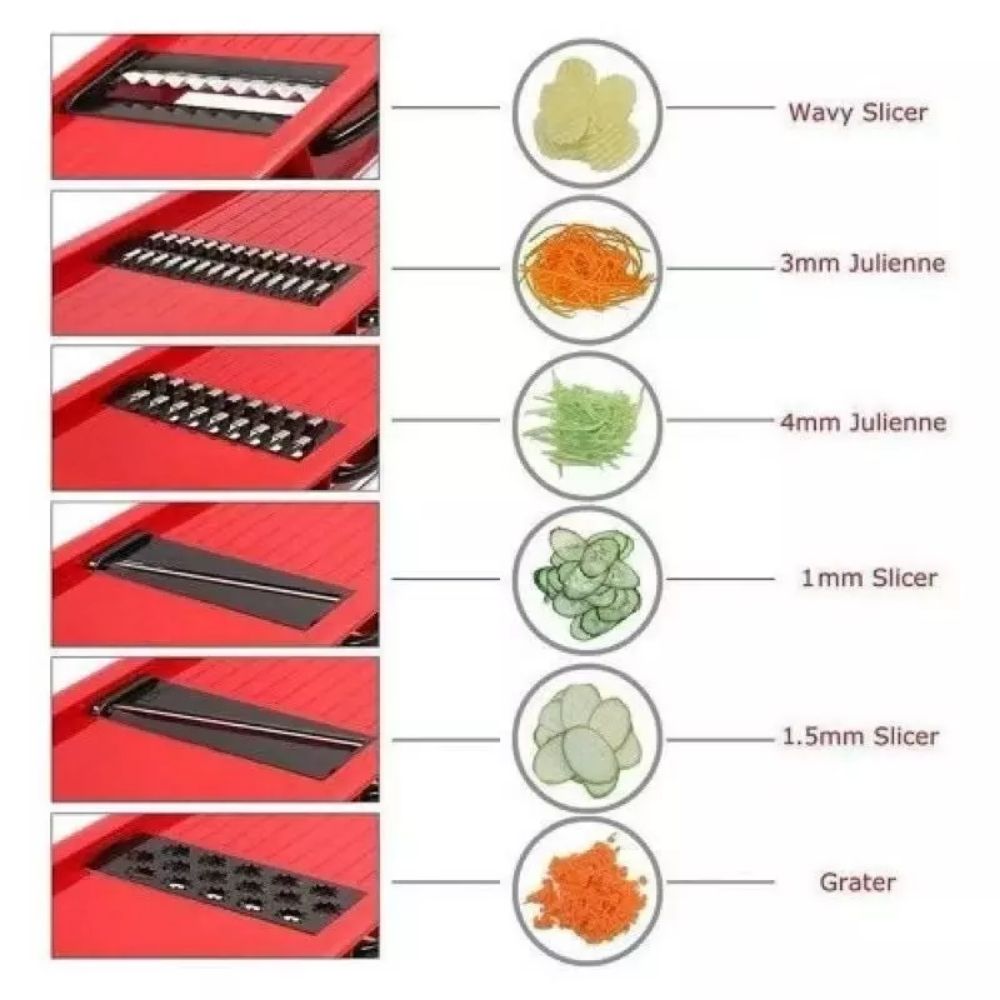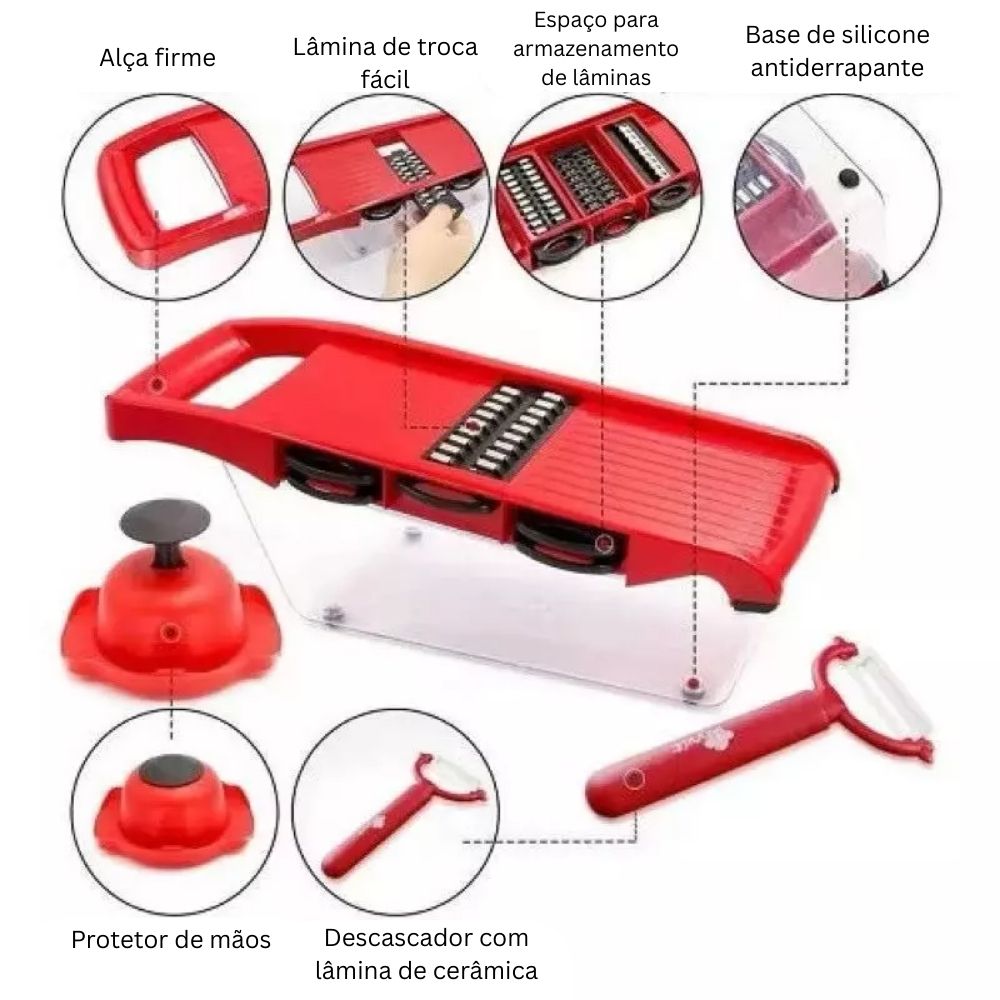 - Multifuncional: 6 tipos de lâminas intercambiáveis para cortes variados, desde fatias finas até ralados perfeitos.