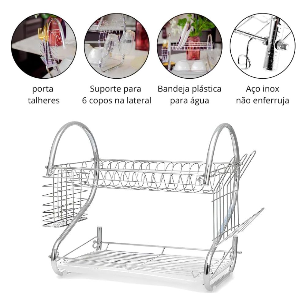 Ideal para cozinhas compactas ou que prezam pela ordem, esse escorredor de louças moderno combina praticidade, durabilidade e design inteligente para transformar sua rotina. Com dois níveis bem distribuídos, ele comporta pratos, copos, talheres e utensílios com facilidade, otimizando cada centímetro da sua bancada. Além disso, possui porta-talheres e porta-copos laterais, e uma bandeja plástica coletora que mantém sua pia sempre seca.