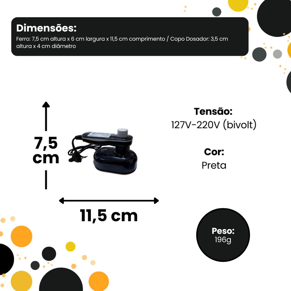 Dimensões: Ferro: 7,5 cm altura x 6 cm largura x 11,5 cm comprimento / Copo Dosador: 3,5 cm altura x 4 cm diâmetro