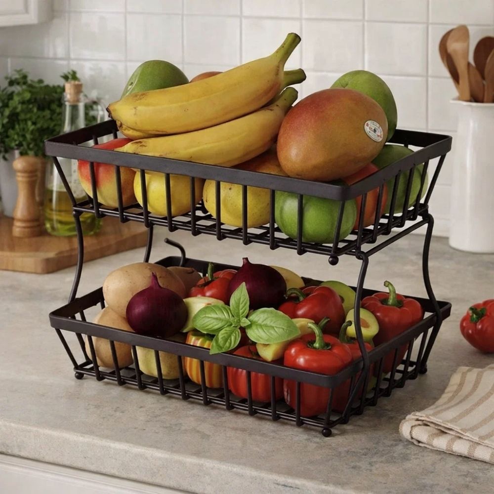 Mantenha sua cozinha organizada, funcional e elegante com esta fruteira metálica de 2 andares, perfeita para armazenar frutas, legumes, verduras, pães e snacks de forma prática e eficiente. Seu design inteligente permite separar os alimentos por categoria ou estágio de maturação, mantendo tudo sempre à vista e facilitando sua rotina na hora de cozinhar ou servir.