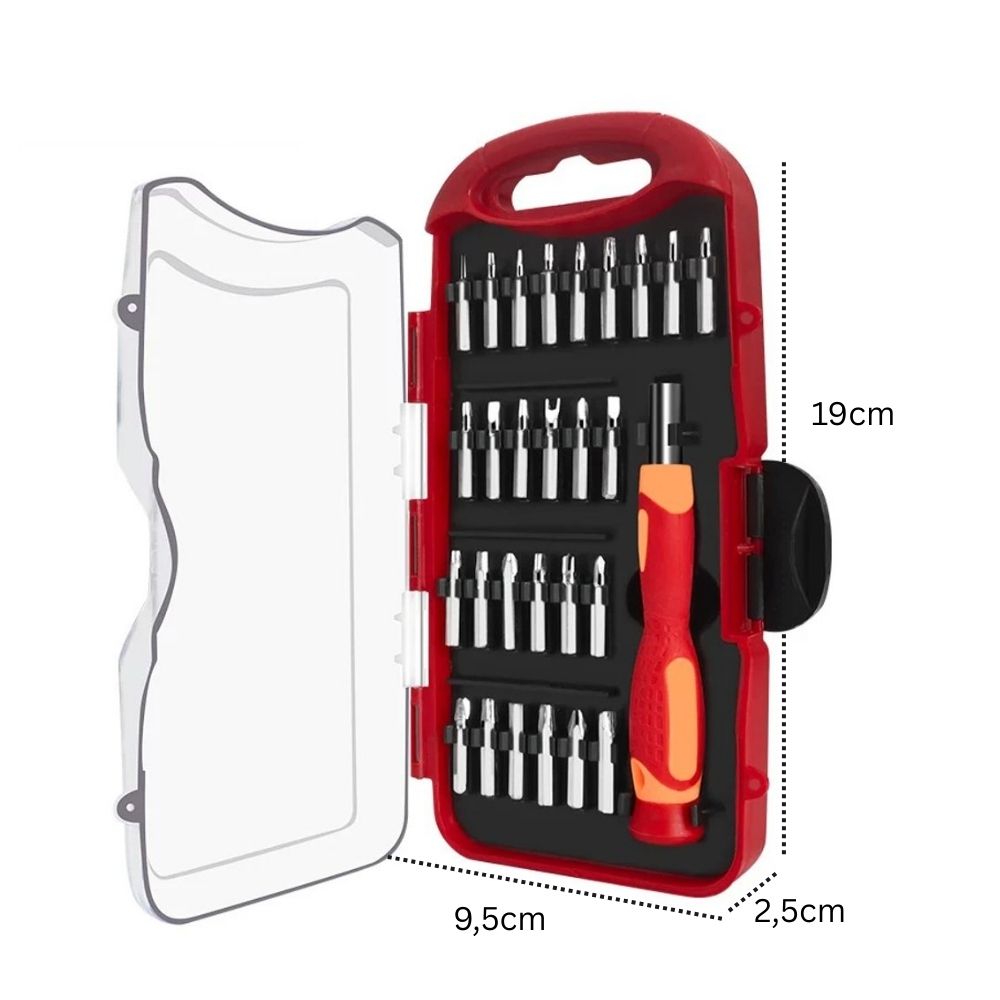 Se você busca praticidade e eficiência para pequenos reparos, manutenção doméstica ou trabalhos técnicos, este jogo de chaves com ponteiras é a solução ideal. Compacto, completo e fácil de transportar, ele atende diversas necessidades do dia a dia, sendo perfeito para eletrônicos, móveis, eletrodomésticos, bicicletas, computadores e ajustes em geral.