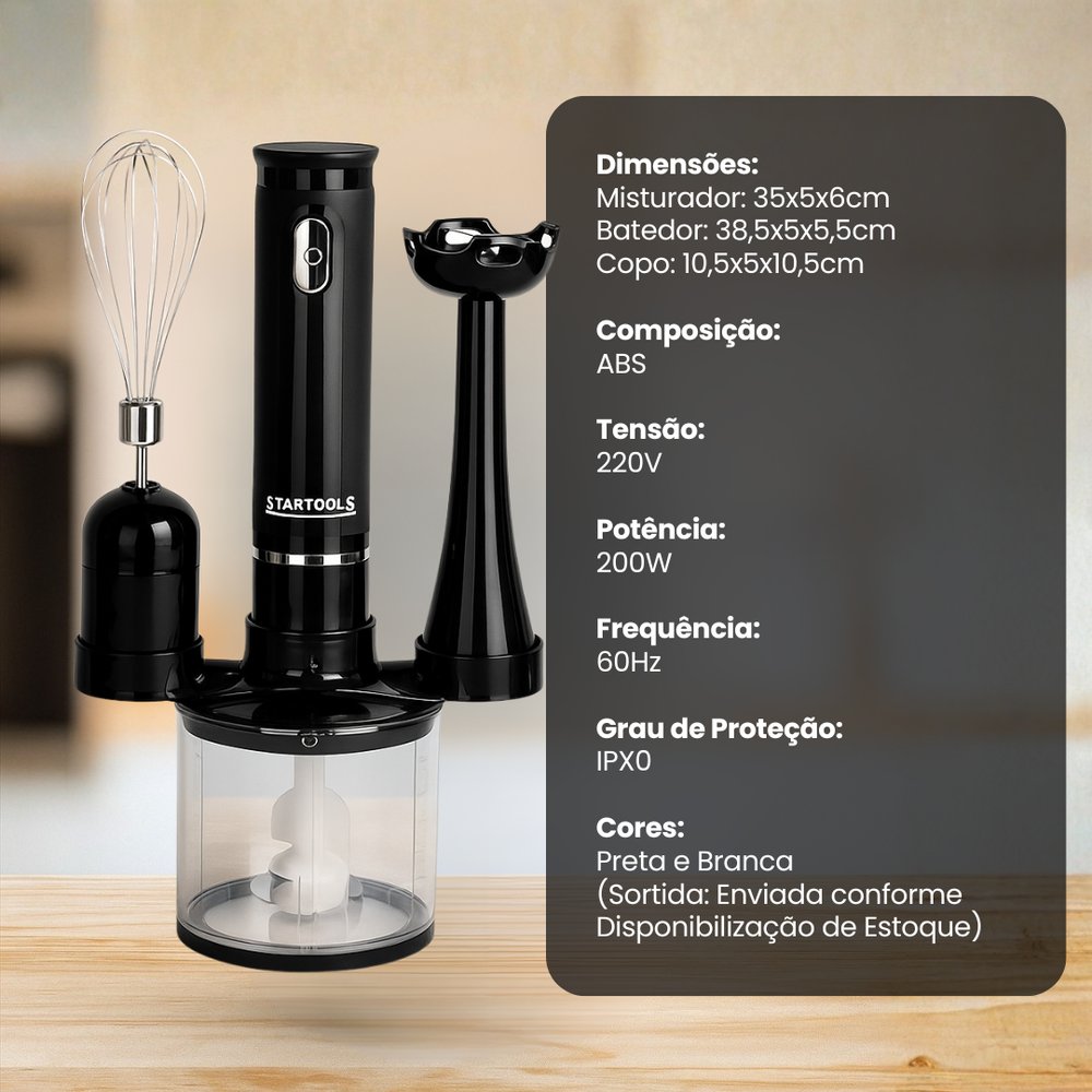 Para quem busca praticidade, eficiência e versatilidade na cozinha, com um design moderno e compacto, ele reúne três funções em um único aparelho: mixer de imersão, mini processador e batedor tipo fouet, oferecendo tudo o que você precisa para preparar receitas com mais agilidade e menos esforço. Com 200W de potência e funcionamento em 220V, o aparelho oferece desempenho consistente para uso doméstico. Ideal para triturar, bater e misturar alimentos com facilidade, ele é perfeito para o preparo de sucos, vitaminas, molhos, cremes, claras em neve e até pequenas porções de alimentos sólidos, como temperos e nozes.