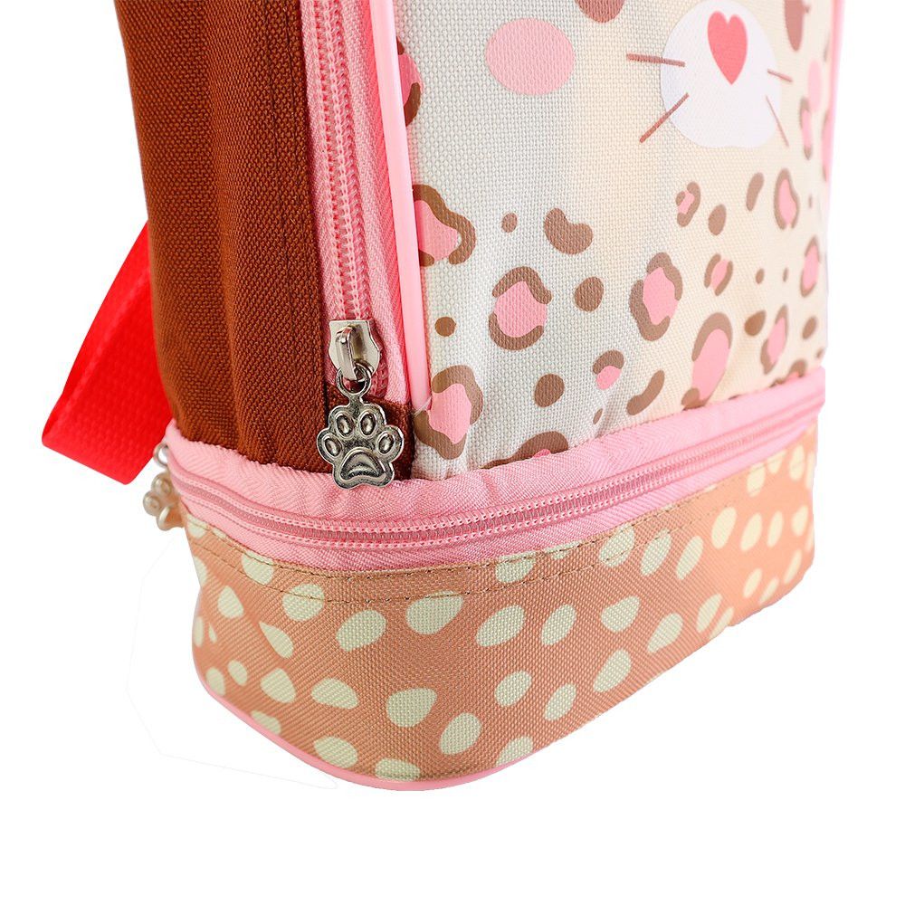 Possui alça de costas, de mão e encaixe para mochila de rodinhas. Além de um detalhe 3D no formato das orelhas da oncinha.