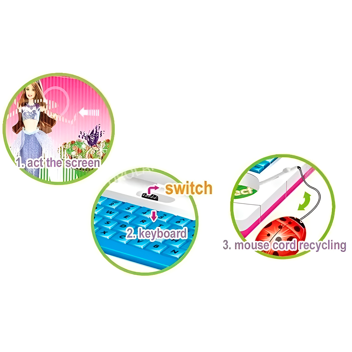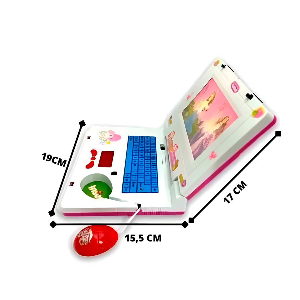 Aferramenta perfeita para aprender brincando! Desenvolvido para estimular o desenvolvimento cognitivo, a coordenação motora e introduzir conceitos de alfabetização e números de uma forma totalmente lúdica e divertida. -Um brinquedo interativo e seguro, projetado para introduzir conceitos básicos de forma lúdica, estimulando o desenvolvimento cognitivo, a coordenação e a familiaridade com a tecnologia. -Possui jogos e módulos que ensinam letras, números, palavras, e formas. -A tela colorida e os gráficos simples ajudam a desenvolver a percepção visual e o reconhecimento de objetos. Especificações Técnicas: – Material: PP/Componentes elétricos – Dimensões Aprox.: 17cm (ALTURA) x 19cm (LARGURA) x 15,5cm (PROFUNDIDADE) – Cor: Rosa – Com mouse de joaninha – Fonte de alimentação: 3 pilhas AA (NÃO INCLUSAS) – Luz e som – Idade mínima recomendada: +03 anos Itens Inclusos: – 01x Laptop infantil – 01x Cartela de adesivos