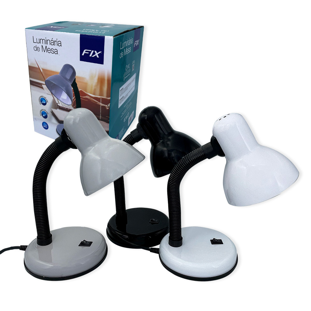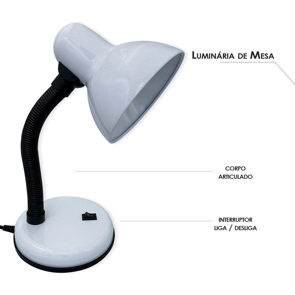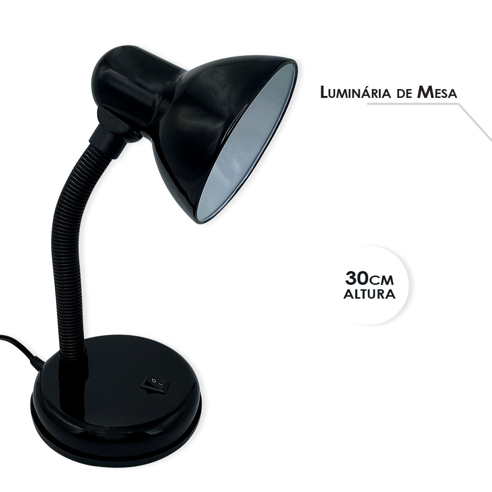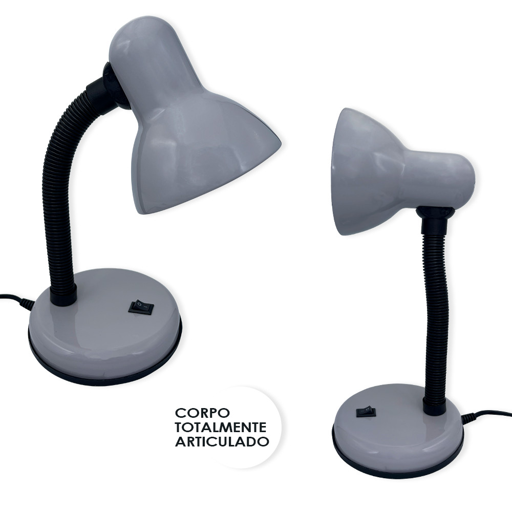 Luminária de Mesa Flexível Essa luminária é perfeita para usar em mesas, bancadas, escritórios, ideal para leitura ou digitação em lugares com pouca luminosidade. O corpo é flexível podendo articular para todos os lados.  Vem com interruptor liga e desliga, bucal da lâmpada com entrada e-27 aceita qualquer tipo de lâmpada até 40w. Deixe sei cantinho mais iluminado e prático.