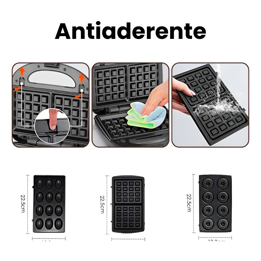 Máquina 3 em 1 Waffle Donuts Biscoito 110v 850W Panquequeira Sanduicheira com Plascas Removíveis