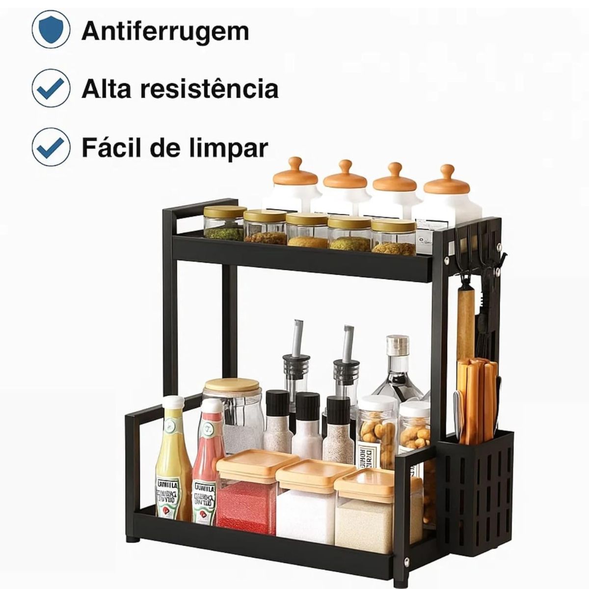 Mantenha sua cozinha, bancada ou área de serviço sempre organizada com este organizador de cozinha multiuso de 2 andares em metal preto. Funciona também como rack de armazenamento, ideal para guardar temperos, utensílios, frascos, talheres e muito mais, aproveitando o espaço vertical sem ocupar área útil da bancada.