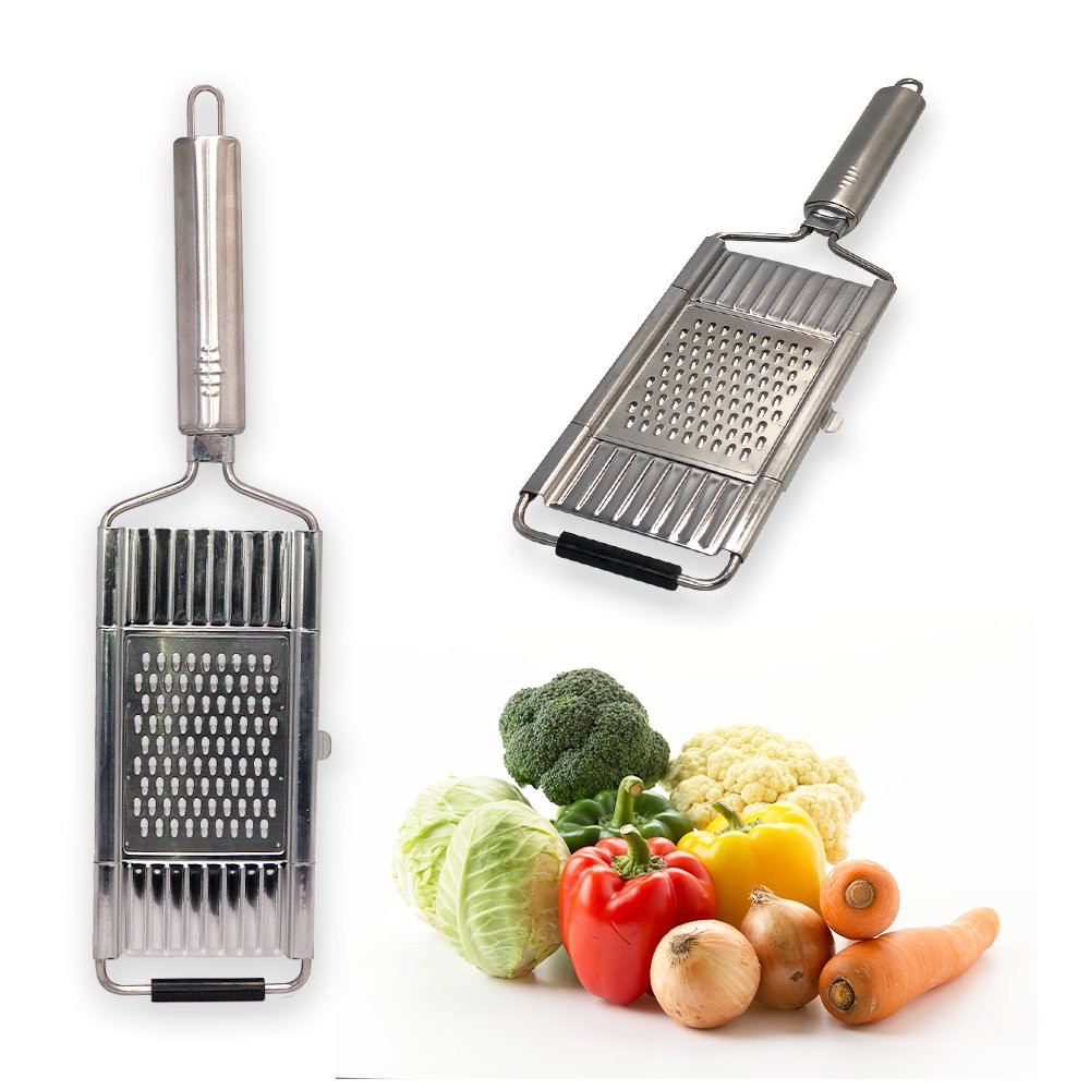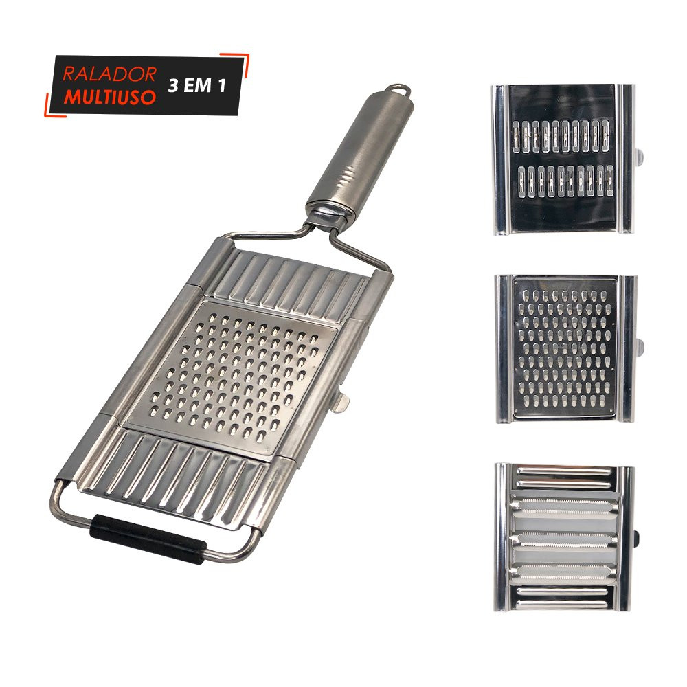 Ralador Multiuso com 3 Lâminas Removíveis. Feito com design elegante e funcional o ralador em aço é uma ferramenta essencial para tornar suas refeições mais práticas e saborosas! Você poderá transformar seus alimentos favoritos em deliciosas opções raladas em questão de segundos. Seja para adicionar um toque crocante a saladas, criar fios de legumes para refogados ou preparar ingredientes para suas receitas favoritas, nosso ralador é o parceiro perfeito na cozinha. Desfrute da praticidade de ralar alimentos de forma rápida e eficiente, além disso, nosso ralador é fácil de limpar e possui 3 lâminas removíveis.