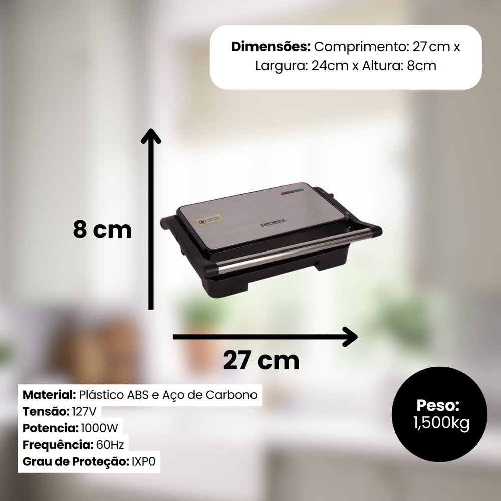 Compacta e versátil, é ideal para cozinhas domésticas, escritórios ou para quem busca refeições rápidas, saborosas e sem sujeira. Basta um toque para saborear um lanche saudável, um grelhado leve ou pão tostado na medida certa.