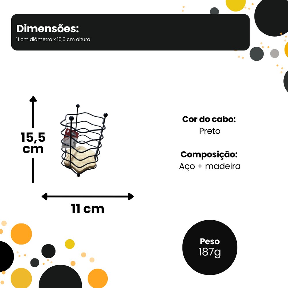 Seu design aramado em aço permite excelente ventilação, ajudando a evitar o acúmulo de umidade e contribuindo para uma melhor higiene dos talheres. A pintura preta garante resistência e durabilidade para o uso diário, enquanto a base em madeira natural agrega charme, elegância e um toque acolhedor à decoração.